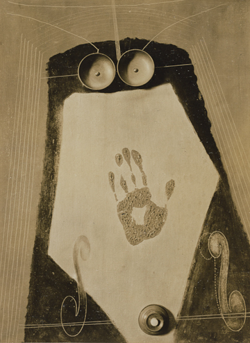 The exhibition is liberally punctuated with self-portraits of Man Ray, and portraits of him by others, most notably Picasso, who half-obscured his subject’s face behind an ink blot, reflecting, according to Mason, the elusiveness of his character. Man Ray’s early self-portrait (1914) in brush and black ink is equally abstracted, presenting himself entirely in his own terms, moody and enveloped in his own thoughts. The same year he manifested himself much more boldly, not in a representation of his physical appearance, but in the letters of his own name, seemingly carved in stone on a surface which blends the New Jersey Palisades with the wooded areas beyond them. (At that time the artist found liberation in an artist’s colony in Ridgefield, New Jersey.) In his 1916 self-portrait, he reduced his face to an assemblage over a dark smear boxed in by lines suggestive of a coffin. His eyes are represented by telephone ringers and his genitalia by a push button flanked by f-holes. A hand-print in thick impasto spans the solar plexus and the chest, creating a striking pun between media and spoken languages. The hieroglyphically represented French word for hand, main, states his self-devised name (truncated from “Emmanuel”), as well as the male human in the most general terms. Together, the words make a strong statement of his identity as a maker, or artist. The Auto Portrait of 1933, consisting of a life mask wrapped in newspapers and set in a box, is the most hermetic—and hieratic—of them all. He photographed himself in his studio, with his camera, standing and smoking in an elegant suit. We also see him seated sadly on a curb in Hollywood in front of a Parisian street sign, indicating the Rue de la Vieille Lanterne—somewhat ominously, since the Parisian original was where Gérard de Nerval, a surrealist hero, hanged himself in 1855.