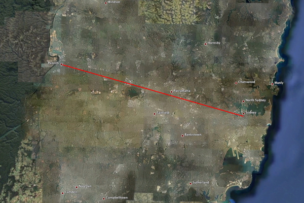 If we draw the same line from downtown Sydney to the west (to the east, because Sydney developers have not yet figured out how to build McMansions in the ocean (Barangaroo’s egregious aquatic hotel notwithstanding) the Tasman Sea acts as a natural city wall which produces in the eastern suburbs several of the densest and most desirable neighborhoods in the city) we end up at Penrith, which is most definitely a suburb, connected to the city by a nearly unbroken carpet of development. The Blue Mountains, which rise just west of Penrith, are unfortunately too far out to form an effective wall (except, perhaps, for a future Sydney of 20 million people, God help us...).