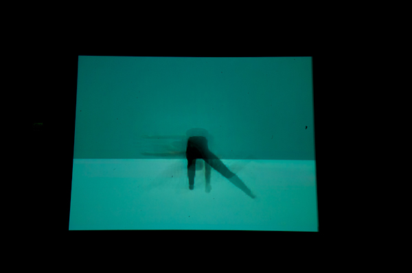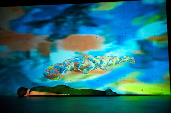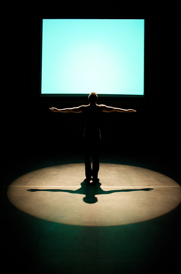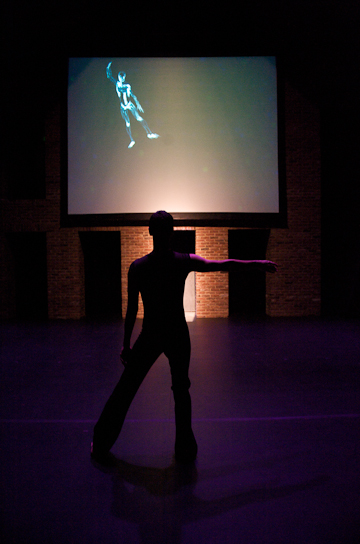 Bokaer's invention and style flourish on an aesthetic of discontinuity. In his work you will never see symmetrical attitudes or balanced sequences of movement, with the equilibrium of the beginning restored at the end. Both incident and form appear to unfold by chance, in Bokaer's personal world of randomness, although there is throughout the performance a sense that he knows where he intends to go in the end. Cybernetics are present and active, both in the design of the performance, as the movement unfolds, and as sequences conclude. The presence of a MacBook on stage makes this explicit. Manipulated projections of the dancer's body, both instantaneous and recorded, sometimes drained of shape into pure movement and/or color. In much of the earlier and later parts of the performance, he disappeared entirely from the immediate stage, leaving the audience to watch the digitally generated clouds of movement.