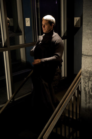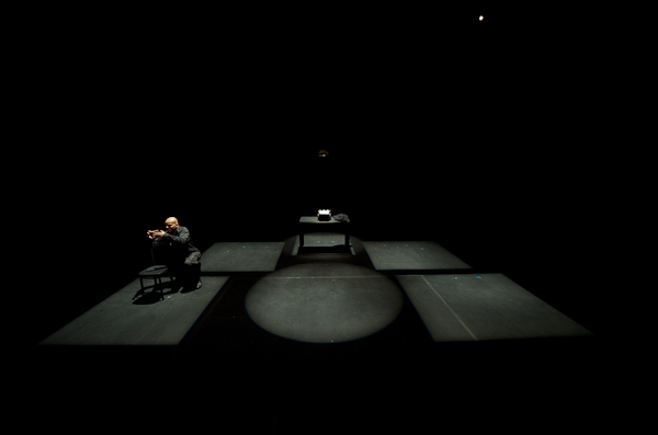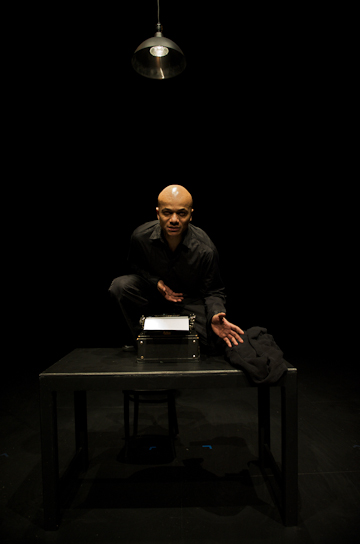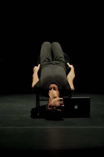If Bokaer stripped to the skin and beyond through x-ray video, to his own sinews and bones, Sangare went even further — into the soul, and that is where his play took place — in the interior hell of his character, a frustrated actor turned theatre critic — undone by a preliminary interview before his entrance exam for the theatre academy. The character is constantly tortured by his sense of failure and his bitterness towards others, above all his present colleagues, the theatre critics. In his title, True Theatre Critic, Sangare starts his audience off with a disturbing irony. If the theatre and the work of all its children — playwrights, directors, actors, set designers, and lighting directors — are a lie, a deception, intended to dupe the audience into credulity and a willingness to join them in their never-never land, how can a theatre critic partake of truth? Perhaps only by misunderstanding the craft, which is what made a critic out of a creator in the first place. And if the business of the theatre critic is founded on a thorough and profound misunderstanding of the stage, what value, or even relevance has he in this delusive world. None, of course. His world is disconnected, not only from the theatre, but from the "real world" as well, making True Theatre Critic a study in tormented ineffectuality and impotence.