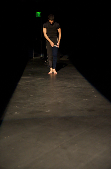 By contrast one scene involved only the dancer himself and his costume, and was anything but discontinuous, since he removed layer after layer, extending them from the top of the black box space to the stage and across it, laying each garment end to end in a prodigious strip-tease. If the projected images seemed to provide continuity, Mr. Bokaer appeared intermittently but potently, from different corners of the theatre, both above and below. One might be tempted to say that there was something cat-like in Bokaer's ranginess, but, with his consciously imposed caesurae and fragmentary purposefulness, the nature of his movement seemed all the more essentially human, and specifically male. Bokaer is a tall, obviously extremely fit man in the prime of life, and this entails a certain mass and weight. He refuses to conceal this, consciously rejecting a tradition among male dancers, going back to ballet, of feigning weightlessness and rubbery flexibility. He emphasized his physicality in a sequence in which he climbed a ladder, naked, and consumed a large bottle of water, which brought about the expected alteration of his body. He also ate an apple during another segment. In this, he shows an understanding of the human form, of his own in particular, that is truly extraordinary.