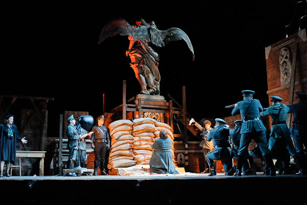 Boston Lyric Opera’s production was a great success, as audiences realized. I saw the final night, and there was murmuring among the staff and also among audience members who had attended more than once, that this was the best performance of the run. The production was adapted from the Scottish Opera, and much good sense, dramatic conviction, and imagination were shown, evidently in the Scottish Opera original and certainly in the Boston adaptation. The original setting of the 1900 Tosca is the early nineteenth century, with rumors of Napoleon’s approach as a liberator from oppression. The present production, like others before it, moves the time to Mussolini-era Italy, and this works very well. The evil chief of police, Baron Scarpia, and his minions look appropriately scary in their Fascist, Nazi-like uniforms — this more recent instance of political terror is easier for an audience to relate to than Napoleonic Europe, which has now an aura of romance about it. The sets, beautifully lighted, are magnificent and drew applause on their own — the interior of the vast church of Sant’Andrea della Valle; Scarpia’s Palazzo Farnese office with its high marble walls and grand windows and now touches of 1920s furniture; the top of the Castel Sant’Angelo tower with the great statue of Saint Michael, here set up for executions and for photographing the corpses under an arc light. The diva Floria Tosca and the painter Mario Cavaradossi, her lover, looked quite appropriate in the high-end bohemian clothes that prosperous and popular artists would wear in the 1920s — less barrier here than with quaint early-nineteenth-century attire.