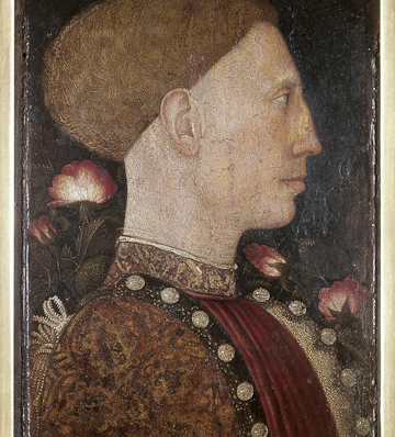 A visit appropriately begins with Pisanello’s (?) Portrait of Lionello d’Este (1441?), a revolutionary piece that ushered in a new era of portraiture without yet leaving behind the compositional scheme typical of late Gothicism. Pisanello’s fascination with Roman medallions is immediately detectable in the symmetry of his framing and the classicism of the subject’s profile. The lush roses in the background and the young man’s jewel studded jacket foretell the richness of color that will ultimately make Venice famous. This is even more apparent in Giovanni Bellini’s Cristo in pietà tra Maria e Giovanni (1455 circa) and the marvelous Madonna and Child (1476 circa). Mary’s gaze is more detached and less anxious in the latter as her corpulent child leans away, wanting to exercise his independence as soon as possible. This together with a more expansive and meticulously painted landscape indicates that the Venetians were increasingly embracing the idea of a rational harmony between mankind and nature.