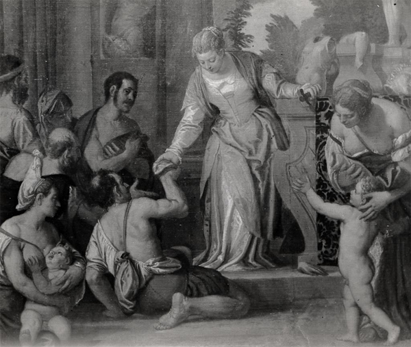 The reasons for which Titian changed his style around the time Veronese and Tintoretto came onto the scene () have been a source of vigorous discussion. We see a greater firmness and plasticity in Titian’s figures and less vibrancy in his coloring, mainly due to a broader, freer application of paint. Aging may partially account for these changes, but there is also the unmistakable influence of Michelangelo. Veronese too was aging by the time he finished the central subject in Saint Christine distributes fragments of the idols among the poor, but a sustained study of the painting helps us to understand that both he and Titian may have deliberately employed a sparseness of paint precisely to achieve a greater sense of mass and solidity. Veronese’s genius lies in his realization that such an effect could only have been achieved by a new type of illusionism and a varied palette of complementary and contrasting colors applied with broad, tight brush strokes that accentuate form and contour. Perhaps Titian realized this too. Saint Christine distributes fragments of the idols among the poor is relatively small in comparison with Veronese’s better known pieces, but it is the reduced scale and uncomplicated composition that allow us to appreciate more readily the stupendous results of his technique. The picture has a theatrical mood similar to the Wedding at Cana at the Louvre, but if we concentrate on the figure of the saint — which recent scholarship now attributes to the hand of the artist — we are left with the impression that Veronese resisted mannerism precisely in order to emphasize form and mass without distorting figure.