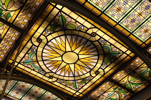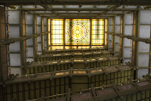 Sydney commercial buildings of this era expressed their striving in various ways. A highlight of Sydney Open was the National Mutual Building (1891-95) on George Street. One day several years ago, after catching the merest glimpse of its magnificent full height stairwell, I was unceremoniously denied access to the building by a security guard. The building, built as the headquarters of the American Equitable Life Assurance Company, is an unashamedly seductive advertisement for an immaterial product. It subtly distinguishes itself from its neighbors; while most buildings along George Street open directly onto the footpath, The National Mutual Building draws its customers up a short flight of stairs. Through the front door is one of Sydney’s great lobbies, though there is nothing particularly Sydney about it. The staircase is clad in Belgian marble and the vestibule in white Italian marble. The entry sequence maintains a sumptuousness which draws the eye in from the street and culminates in a view of the the glowing stained glass ceiling six floors above. The exterior is designed in a solid Romanesque style which vaguely recalls H. H. Richardson while inside, following American precedent, the structural steel frame is expressed, adding to the visual lightness of the stair. In summary, a fine old building from New York or Chicago has been plonked down on George Street.