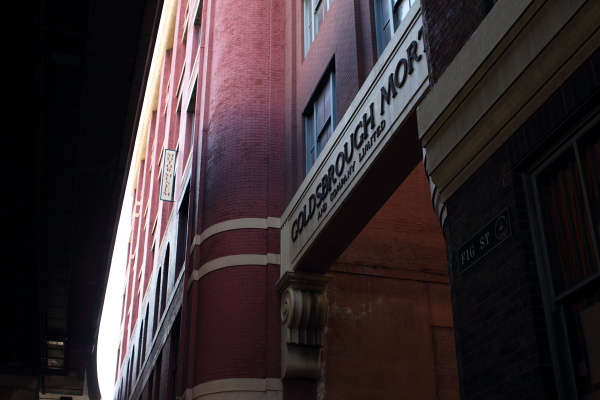Buildings from the latter part of the 19th and early part of the 20th centuries represent both continuity and a foreshadowing of the very different downtown which was to come. The Sydney Trades Hall (1888-95, 1902-17, 2001), and the City of Sydney Fire Station (1888, 1912, 2003), are Victorian buildings of moderate scale which have been adapted through time to retain their original function. The fire station, centered on the original, freely classical building by James Barnet, is an especially pleasing ensemble. The twenty first century additions knit the complex together into a state of the art facility. The contemporary glass facade on Castlereagh Street, which I admire whenever I pass, is a good example of the way an almost-Georgian restraint, for better and worse, still influences Sydney architecture. Both the fire station and the trades hall are built mainly of brick, with sandstone used around door and window openings.
