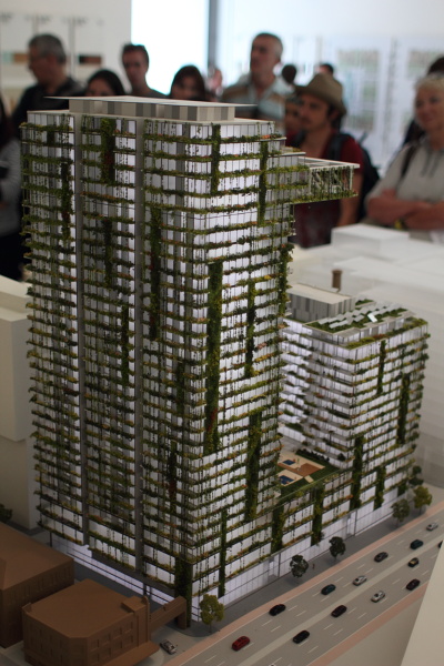 The biggest change in this neighborhood will be Central Park, under construction on the massive site of the former Carlton & United Brewery. The sickly smell of hops which used to waft across the area has been replaced by a giant hole in the ground. I am tempted to call Central Park the Jekyll to Barangaroo’s Hyde. Judging from the admittedly boosterish materials provided in the on-site display pavilion (and the words of the developer himself, who was present on the day of Sydney Open), I see good reason to be optimistic. Unlike Barangaroo, Central Park has a logical and urbane master plan with real streets and tall buildings located in the least disruptive position. The first to be completed will be a thirty five storey building designed by Jean Nouvel, containing a retail base and nearly six hundred apartments above. As at Musée du Quai Branly, French landscape architect and artist Patrick Blanc has collaborated on a vegetated facade, which in the available renderings has a post-apocalyptic feel somehow appropriate to the neigbourhood. Behind the Nouvel building, which will be the same height as the UTS Tower (a ‘landmark’ Nouvel apparently likes!) is a large park. A heroic cantilever near the top of the tower hides a heliostat which will use mirrors to bounce sunlight into the park. At the the western end of the site, Norman Foster has designed a lower office building whose corner hovers over an all-important heritage listed pub.