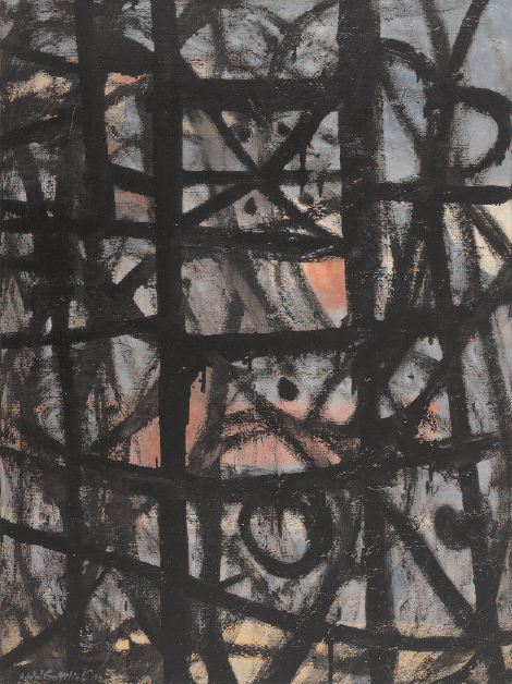 The grids persisted, however, and can still be found as late as the mid-fifties, turned inside-out in a pair of untitled canvases from 1956. Even classic examples of Gottlieb's fully-developed allover painting, like Black, White, Pink and The Cage (1954), retain irregular grids. Here they seem to work more as leitmotifs which both provide structures and outward currents of energy.