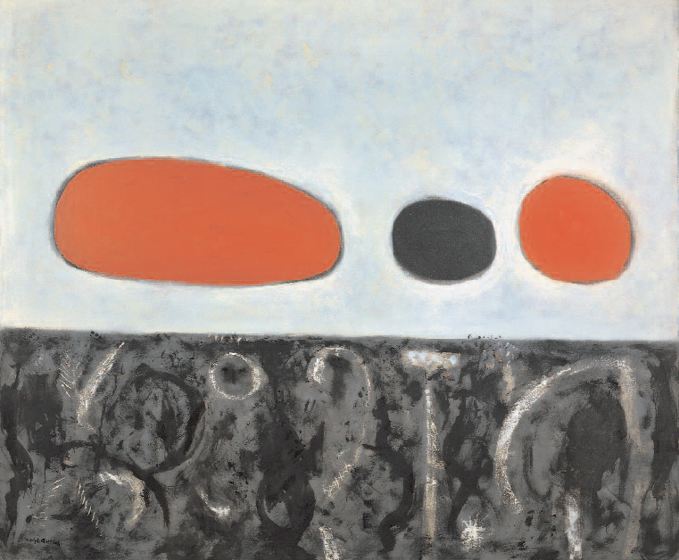 When, in Sea and Tide (1952) Gottlieb began to divide his canvas into a bipartite landscape structure by means of a horizon line and introducing the large ovoid shapes familiar in his late work, he accomplished it by painting a semi-translucent layer of white-greyish tones over an allover design in black grey, and white. While this modification seems an explicit denial of his earlier manner, he allowed it to remain in the lower part as grid-like, textual line of white symbols over turbulent strokes of black paint. Shadows of these remain in the upper segment, but the formal language is replaced by two red eggs separated by a smaller black egg.