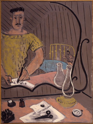 Untitled (Self Portrait in Mirror), c. 1938 not only has an evocative sense of a moment in time and the atmosphere of a specific place, it is a fully conscious expression of the artistic ideas were to animate Gottlieb's work in his maturity. The irregular parallel lines of the wallpaper and indeterminate boundaries of the planes of the wall and ceiling, both as reflected in the mirror and outside it, show an early effort to flatten space into the surface of the canvas. Their self-consciously awkward, "primitive," hand-drawn quality gives them a life of their own, rivalling the elements which would have been the traditional focal points of the composition, the figures. Although, after the mirror itself, the artist is the largest feature, it is present mainly as a witness, as his posture and gaze indicate. The object of his gaze, his wife Esther on the bed, is dwarfed into something like an afterthought. His treatment of curved shapes in the decorative supports and frame of the mirror and the contours of the kerosene lamp contain the seeds of his famous ovoid forms, which he learned to make more irregular through his facture, avoiding an overt decorative effect in the paintings. Most provocative is the ambiguous double rendering of the pink cloth on the top of the dresser or table on which he is working. The work, in fact, is more the subject of the painting than what the artist sees and what he renders. Gottlieb was always insistent that paintings have to be about something, and this is a case in point, even if it is self-referential.