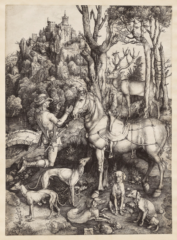 The animal subjects aren't at all a series. The section brings together images as diverse in purpose and ambition as The Monstrous Pig of Landser, 1496, the Virgin and Child with a Monkey, c. 1498, and the St. Eustace of around 1501. While the St. Eustace is one of Dürer's greatest achievements in engraving and a locus classicus for the interweaving of a mystical event with nature in many of its countless forms, the deformed pig may be seen as a sensationalistic exploitation of a freak of nature, as if Dürer might have been a valued employee on the National Enquirer. There was great curiosity about such freaks in Dürer's day as in ours, but the tendency to view them as portents of change or disaster piqued interest and added a larger dimension to the phenomenon. In any case, it was not lost on Dürer as an opportunity for the profitable exercise of his art. Virgin and Child with a Monkey is one of the master's most beautiful madonnas, typically complicated by the symbolism of the vividly drawn monkey as a beast of unbridled lust, here bound to the same fence on which the Virgin serenely sits.