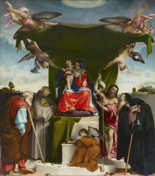 Lorenzo Lotto, Pala di San Bernardino Madonna in trono con il Bambino e i santi Giuseppe, Bernardino da Siena, Giovanni battista e Antonio abate e angeli, 1521, oil on canvas, Bergamo, Chiesa di S. Bernardino.