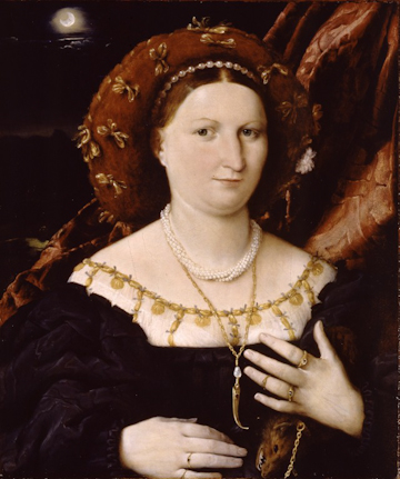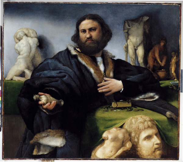 Contemporary writers praised portraits that combined a true likeness with an intellectual conceit, and Lotto excelled at this in his nocturnal portrait of Lucina Brembante, with the moon (luna) containing the letters “ci,” thus hinting at the sitter’s name. Even more impressive is the sumptuous study of the wealthy Venetian collector, Andrea Odoni—on loan from the Royal Collection at Hampton Court—shown with his celebrated collection of antiquities but holding a small sculpture of Diana of Ephesus, which he did not actually own. Some, like a later portrait of a man with a felt hat from Ottawa, present Lotto at his best, communicating an unflinching view of human worth through a restrained palette of colors.